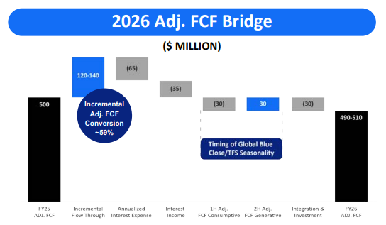 GB Timing of Close / TFS Seasonality: The Global Blue acquisition closed on July 3, 2025 resulting in 2H25 consolidation of operating results. The Tax-Free Shopping business has seasonality with Adj. FCF consumption in CY1H due to NWC growth in the seasonally high shopping periods and Adj. FCF generation in CY2H. On a YoY basis, given the timing of the transaction close, 1H26 will fully absorb the Adj. FCF consumption period while the 2H26 Adj. FCF generation only reflects the incremental Adj. FCF over 2H25 Adj. FCF generated.