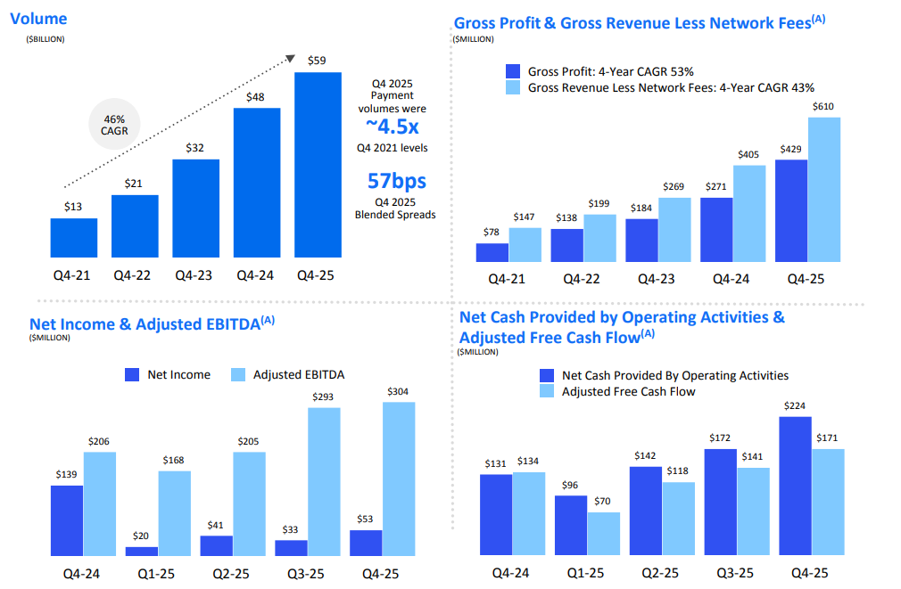 Shift4 delivered decent numbers in Q4 2025. Payment volume grew 23%, GRLNW (Gross Revenue Less Network Fees) grew 51%, Gross Profit grew 58%, and Adjusted EBITDA grew 48%: