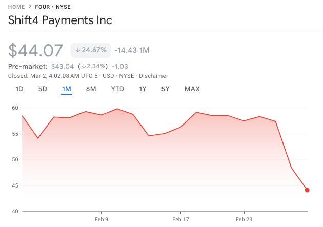 Shift4 reported earnings last week and…let’s just say the market did not like them much. The stock dropped double digits the day of the report and dropped an additional 8% the following day (why not?). The result? A stock that is today trading at $44 when it was trading close to $58 before reporting earnings barely a few days ago: