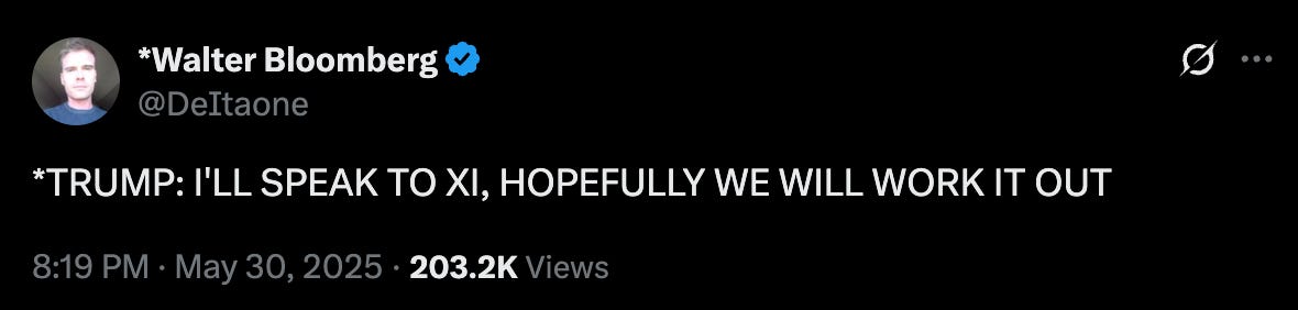The market reacted somewhat negatively, but it has become pretty evident that the market is a “TACO believer”, or what I mentioned last week: that Trump is the boy who cries wolf. The market was proven right again, as Trump said later during the day that he would speak with Xi and work something out (chickened out again!):