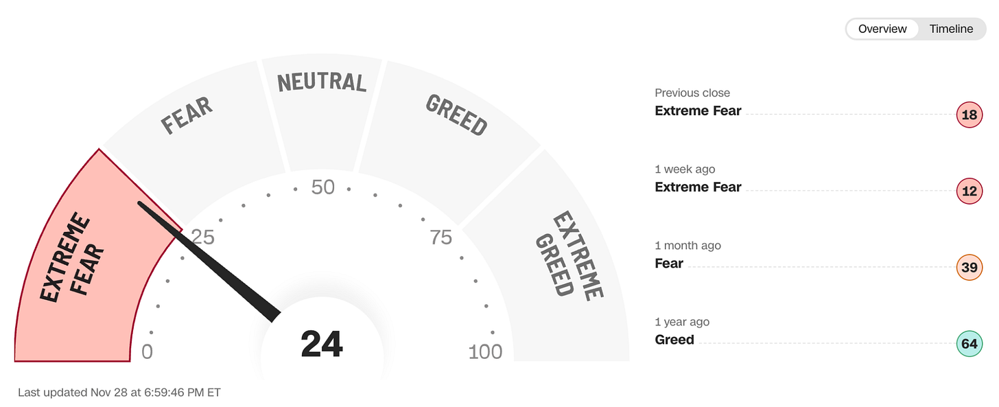The fear and greed index improved considerably and is now close to fear territory. Just for context, this was at 6 a couple of weeks ago (oh, how fast does sentiment change in the market!):
