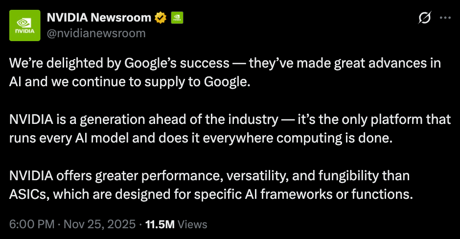 The counterparty appears to be Alphabet. Why? Because a narrative is now forming claiming that TPUs are “better” than GPUs and that Nvidia’s “monopoly” is coming to an end. The company thought it was a good idea to respond to said narrative by posting the following on X: