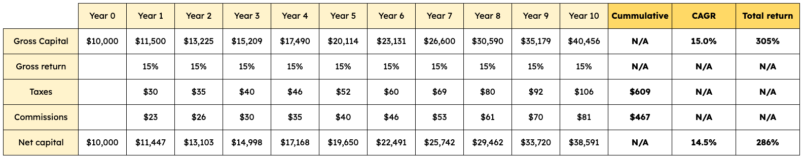 Commissions and taxes play an outsized role in long-term compounding, even if they are “hidden”