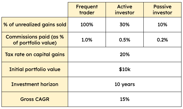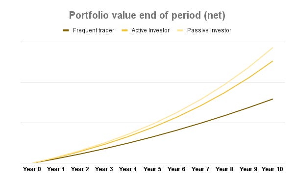 Note that the examples (and the numbers) here are fictional and only intend to differentiate three types of investors in terms of how active they trade their portfolios. Real life is much more complex, but the objective of this article is to show how much these costs can potentially hinder long-term returns.