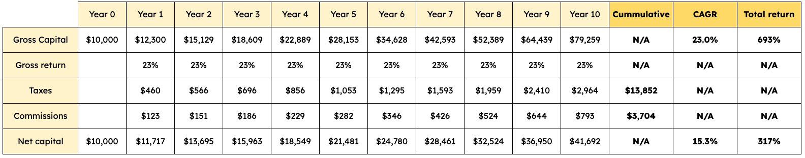 Should an investor generate the same equilibrium CAGR of 23% over a decade without incurring commissions and taxes, their total return would be close to 700%! This should teach us two things…