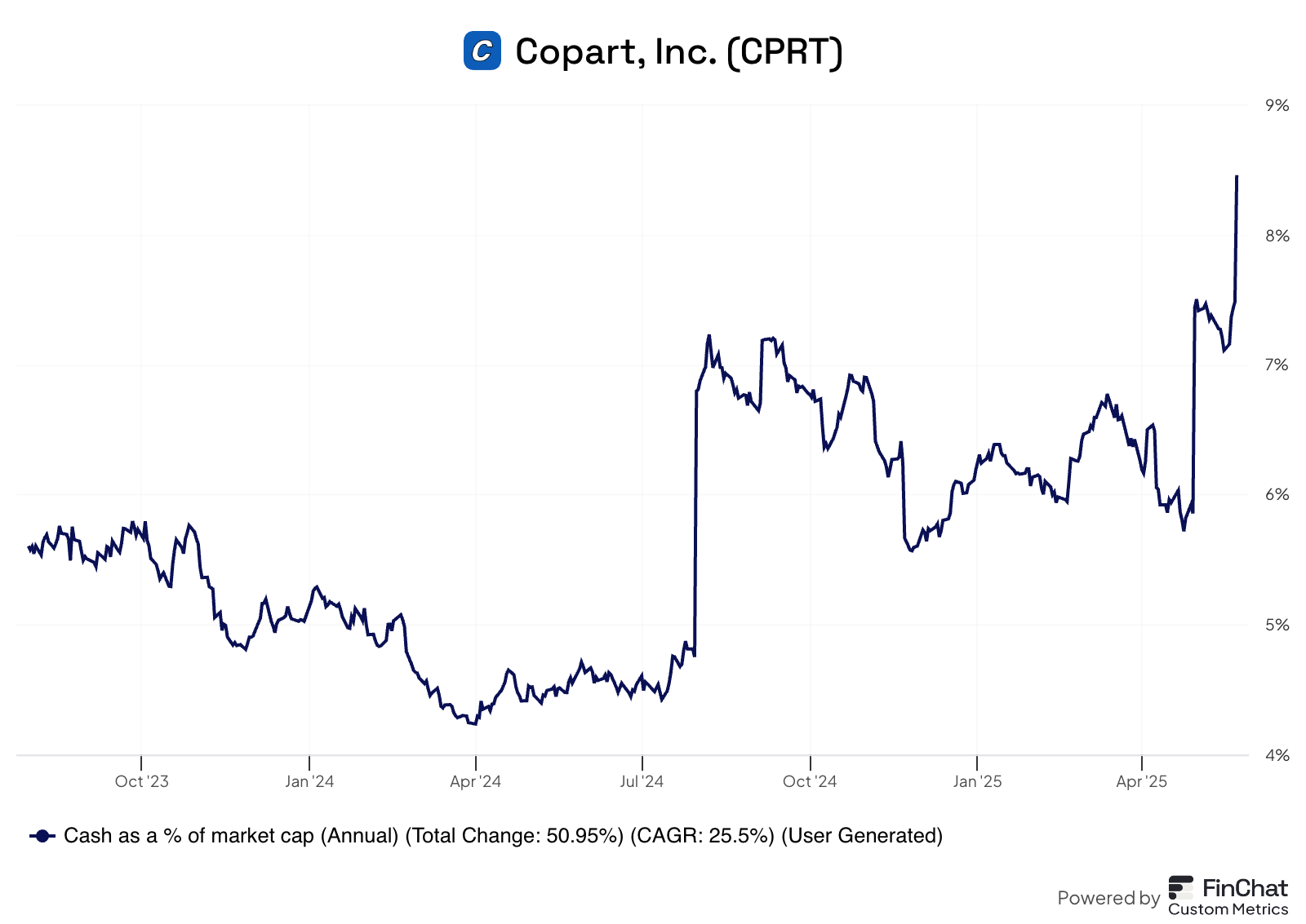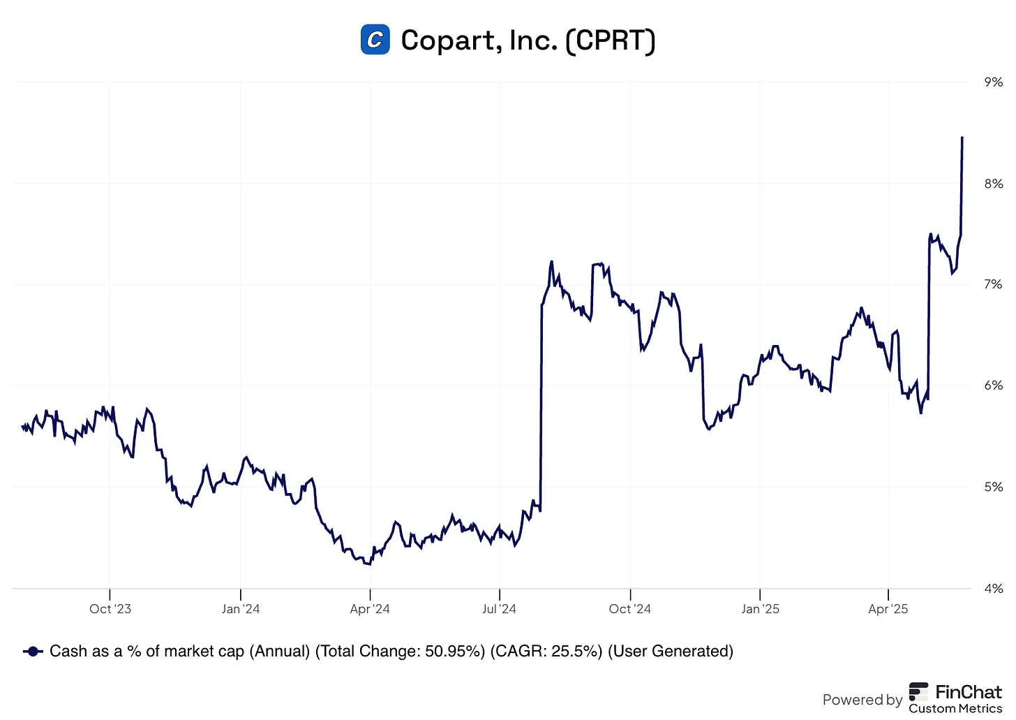 These strong cash flows helped Copart increase its cash position, which now stands at $4.4 billion. The company’s cash as a percentage of market cap has now grown to more than 8%, its highest level in a couple of years (both the high cash flows and the drop of the stock on Friday helped):