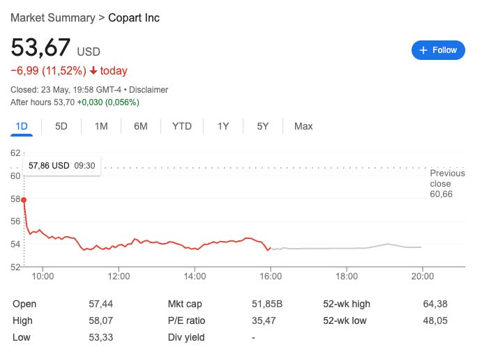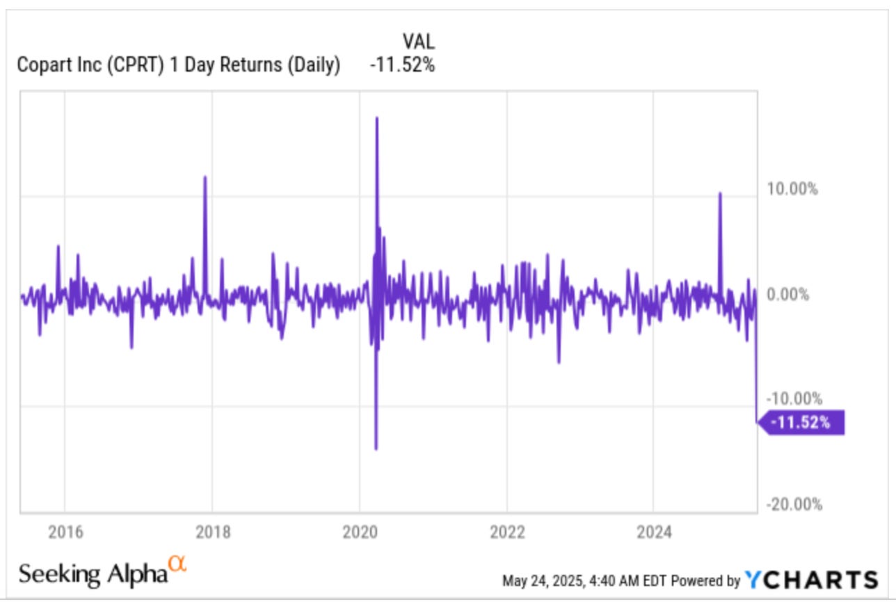 This is a significant one-day drop for any company, but more so for Copart. If we look back, we can see this was Copart’s most significant one-day drop over the last decade (excluding the pandemic):