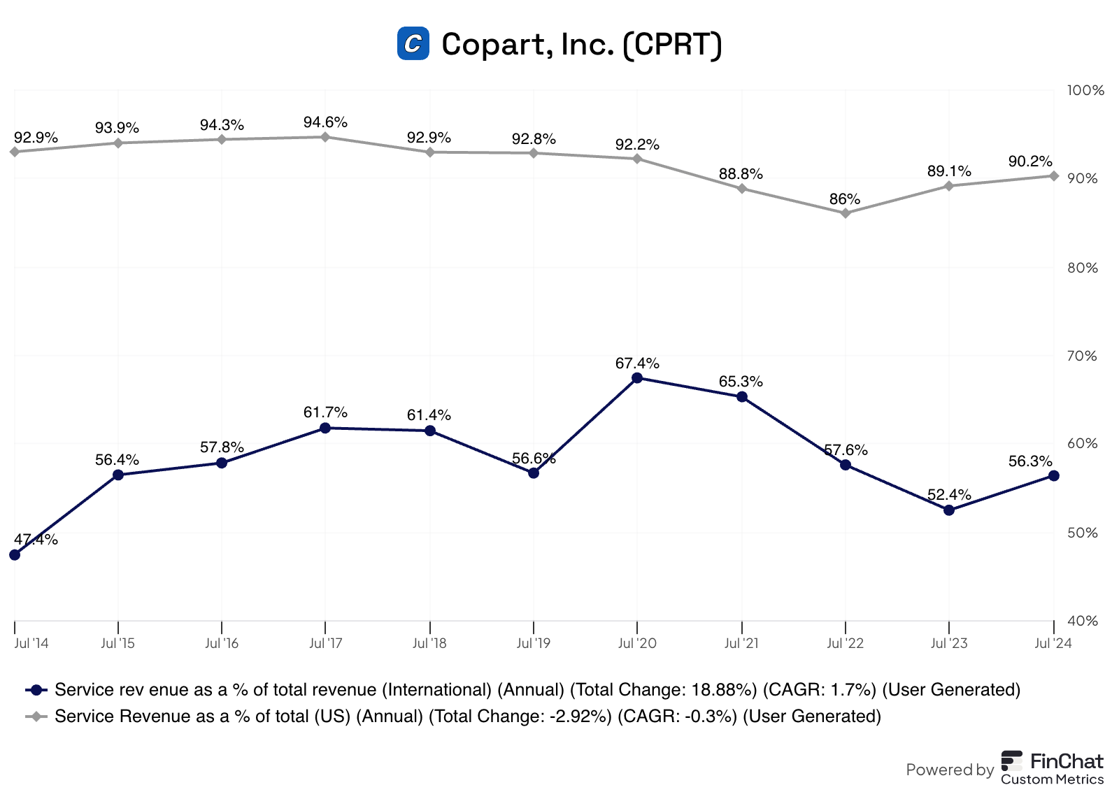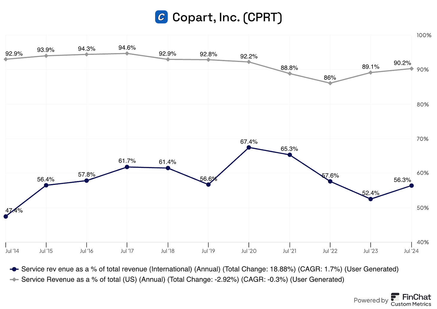 Copart’s international service revenue doesn’t seem to be evolving up and to the right. It seems stagnant below 60%