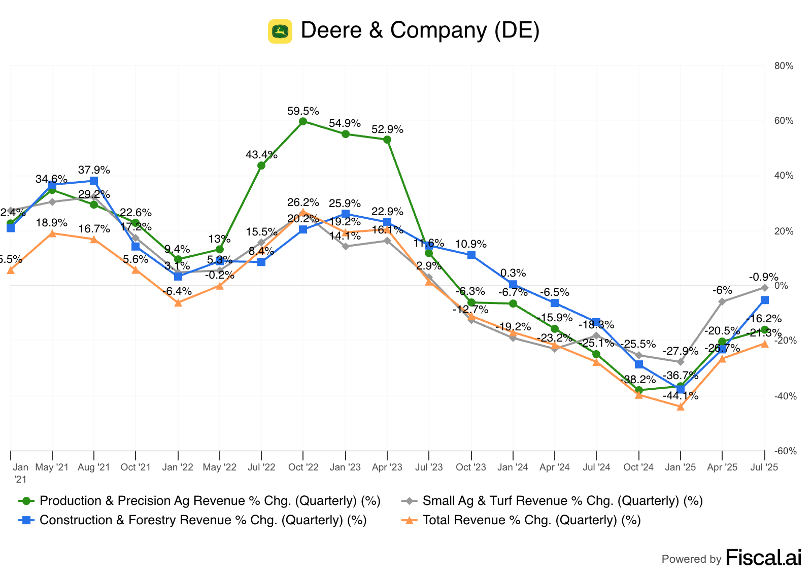 Small Ag & Turf: management expects a 10% drop in sales for FY 2025. This means that sales end somewhere around $9.9 billion in FY 2025. This segment has generated $7.77 billion in revenue so far this year, implying Q4 revenue of $2.13 billion, which would translate into a sales drop of 7.7%