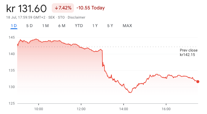 Atlas Copco reported its Q2 earnings last Friday, and the market did not like them at all. The good performance of the stock coming into earnings might have made some believe that the market knew earnings would be good (certainly seemed so!), but the stock dropped like a rock as soon as the report was released: