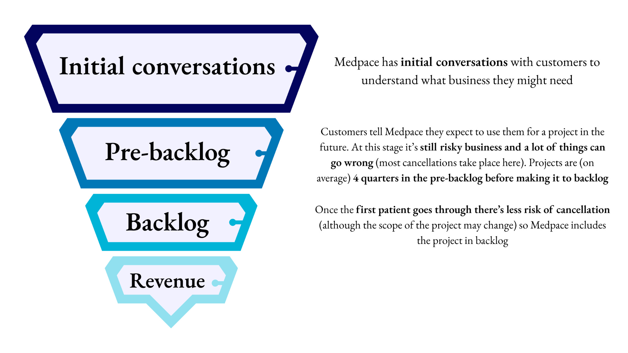 Only the last two stages of this funnel (backlog and revenue) are reported to the market, but Medpace’s qualitative commentary around the first two were positive and somewhat invalidates (or reduces the risk) of the revenue cliff bear thesis. In fact, cancellations in the early stages of the pipeline were lower than in the backlog (which bodes well for future work flowing into the backlog):
