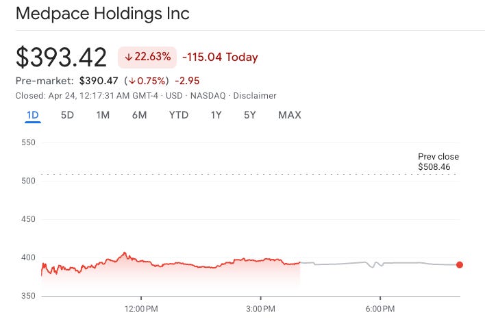 The company started the year growing revenue 27% YoY, which is significantly ahead of the full year guide provided barely three months ago (9% to 13% YoY growth). Despite this delta, management decided to stay put with the guide and simply reconfirmed it. It was likely this plus a relatively “weak” book to bill ratio (0.88x) that caused the violent downward reaction of the stock. Jesse Geiger (Medpace’s President) announced its intention to retire in May, with August taking the position as they look for a replacement. This might have also worried investors because I believe Jesse was considered the “natural” replacement to August, but August calmed the waters claiming that he remains passionate about Medpace and will be at the reins for long (ofc, if his health allows).