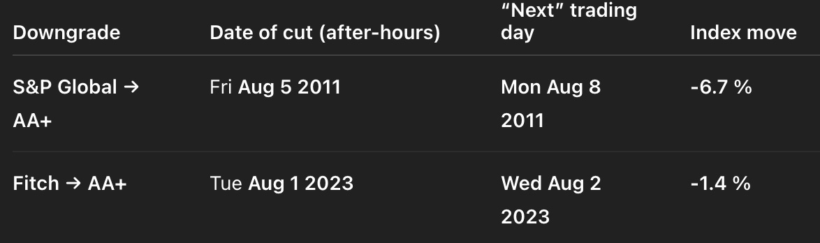 I have no clue what will happen this time around (the QQQ dropped around 1.3% in after-hours trading) but the S&P 500 is up 429% since August 8th 2011 and 32% since August 2nd 2023. What seems obvious is that the debt might have become a tad more expensive both for the US and its underlying businesses.