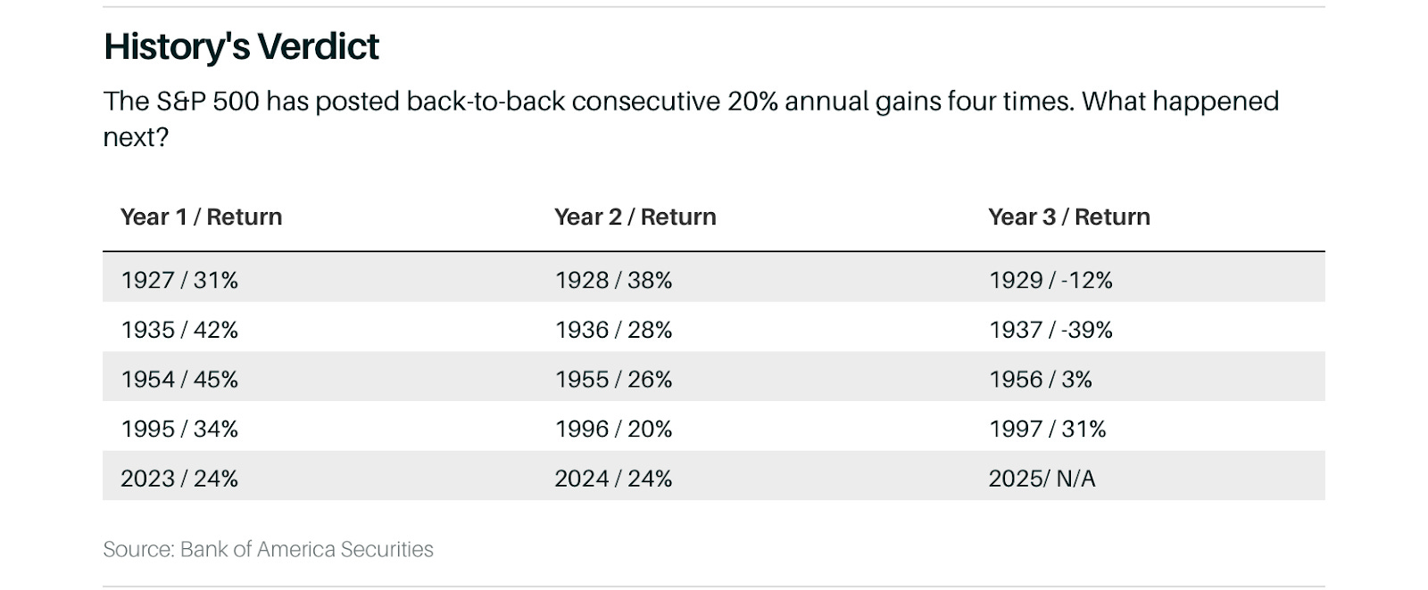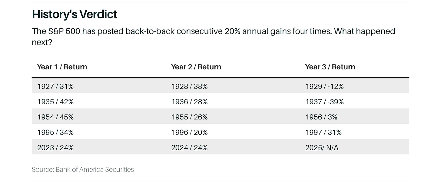 According to Bank of America, there are 4 precedents of two consecutive +20% years in the S&P 500. In two of those scenarios, the market was significantly down the following year; in one of them, it was more or less flat (+3%); in another, it was significantly up. So, the predictive power of two consecutive +20% years is limited.