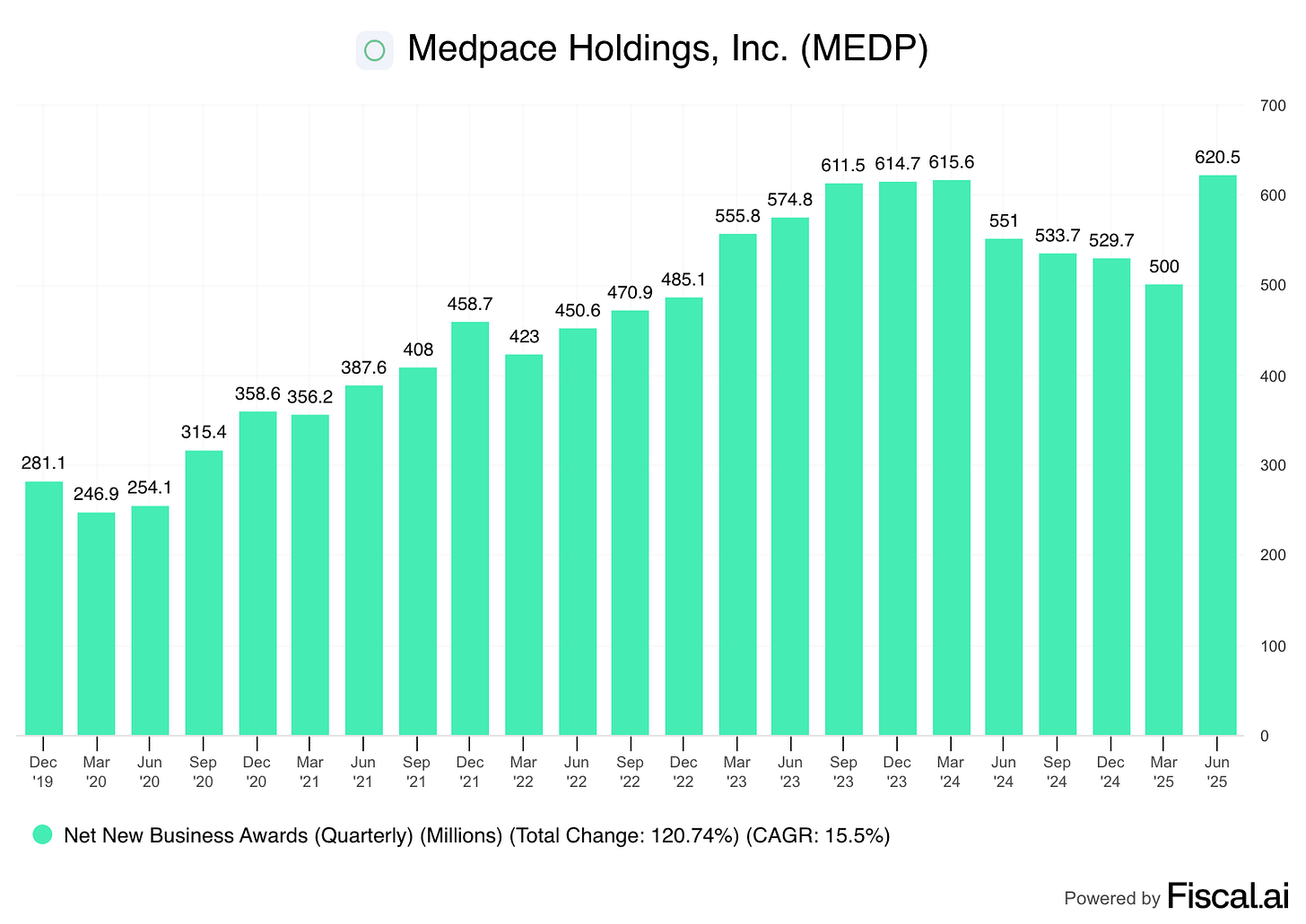 Net new awards were strong even in the face of a lower-than-usual win rate. RFP activity was high and compensated for the lower win rate, so RFP volume won was still at a good level. Management also explained how investors should contextualize the win rate. It’s a dollar-based metric and therefore it’s dependent on the win rate of large projects versus small projects (i.e., not winning a large project is significantly detrimental to the win rate). Medpace does not compete as favorably in large projects, so losing a couple of those can impact the win rate without this necessarily being bad for the business. This is what happened in Q2.