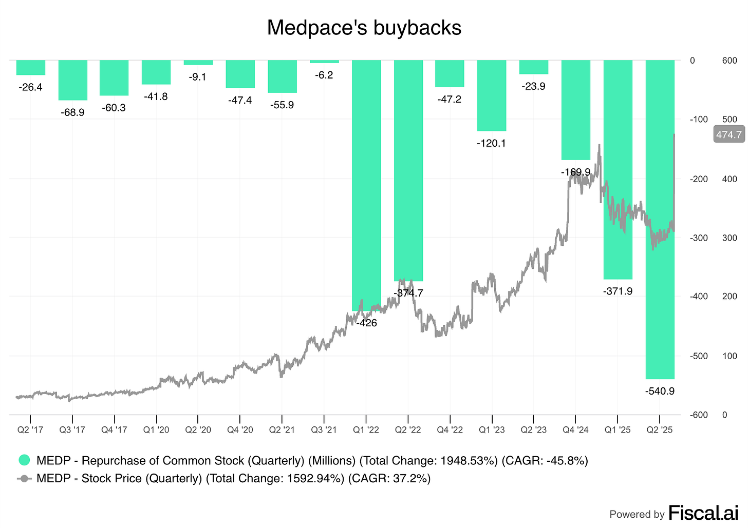 In short: management teams should be able to play “God” in the expectations game. On the other hand, individual investors can do their best to calculate #2, but they will only know #1 for sure. When a good (but not outstanding due to CRO not being the best industry) business like Medpace allocates capital in such a counter-cyclical way, it becomes an extremely interesting company. Capital allocation decisions add up dearly over long periods, and it’s definitely easier to sleep well owning a company where you know that management has got your back.