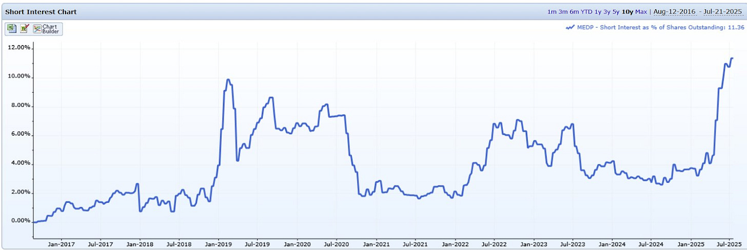 Due to my investment style and the kind of companies I look for, I never thought it was possible to experience a 40%+ appreciation in one day, but this is why one should never say never (I guess). Now, while earnings were exceptional, another element of the story likely added fuel to the fire and enabled this performance: shorts. Medpace had been heavily shorted coming into earnings (10%-12% short interest), so at least a portion of this pop seems to be caused by shorts covering their positions: