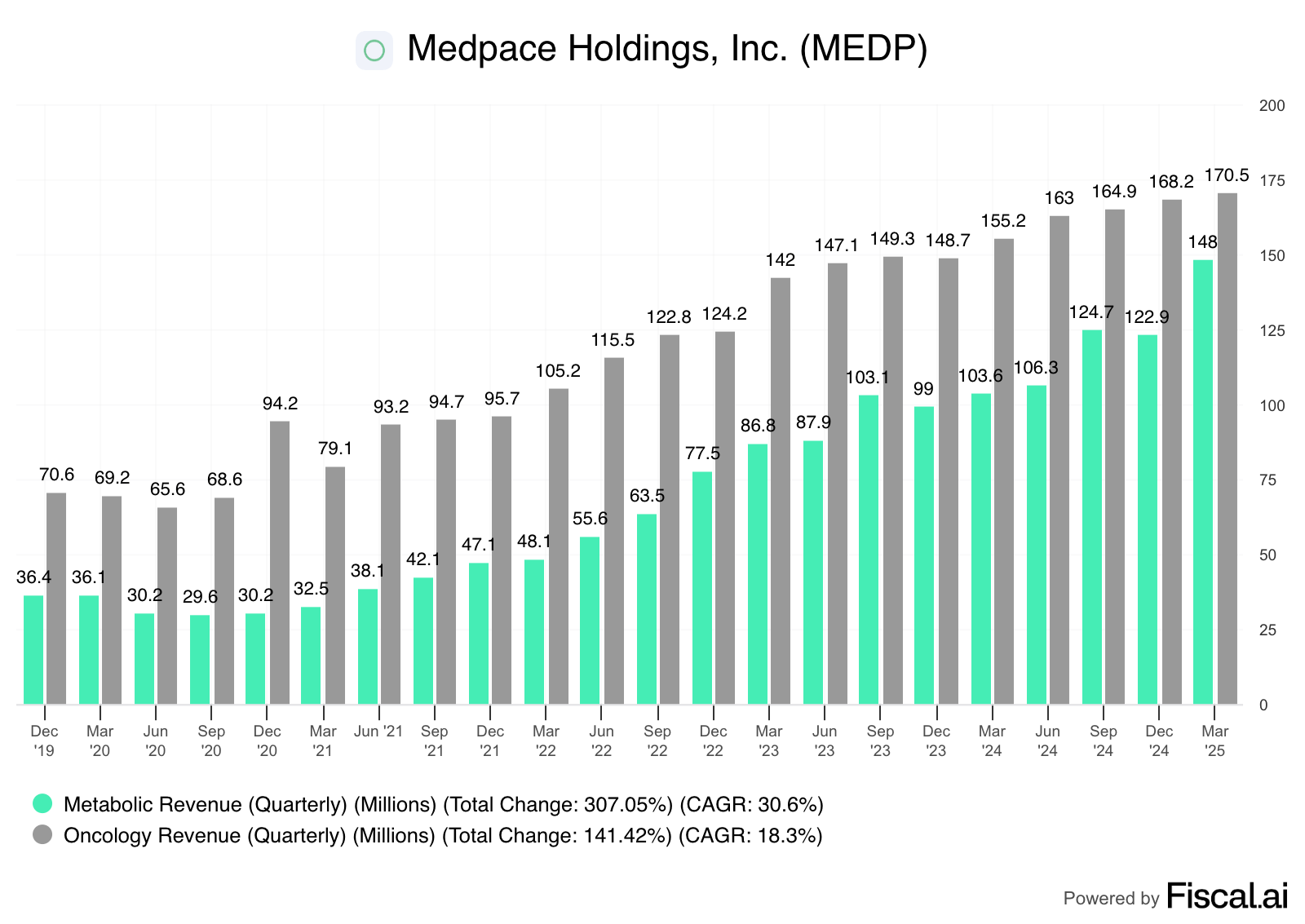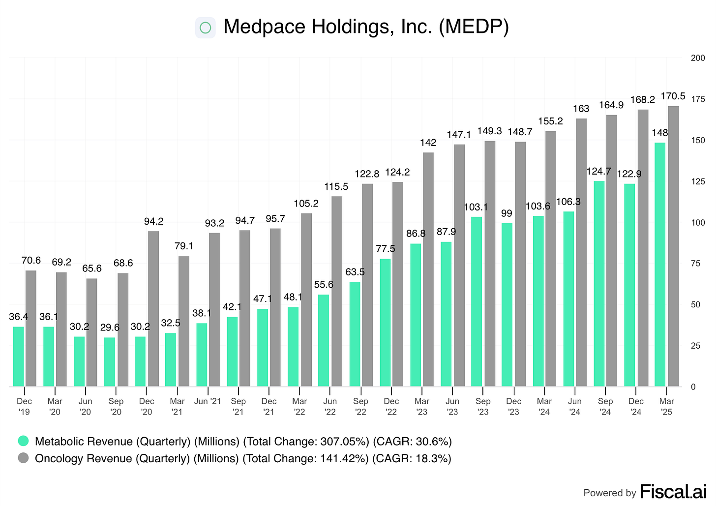 Secondly, the company’s revenue and backlog became more heavily weighted toward metabolic clinical trials, which burn at a faster rate than oncology trials. Metabolic revenue has been growing faster than oncology revenue for a while and is catching up: