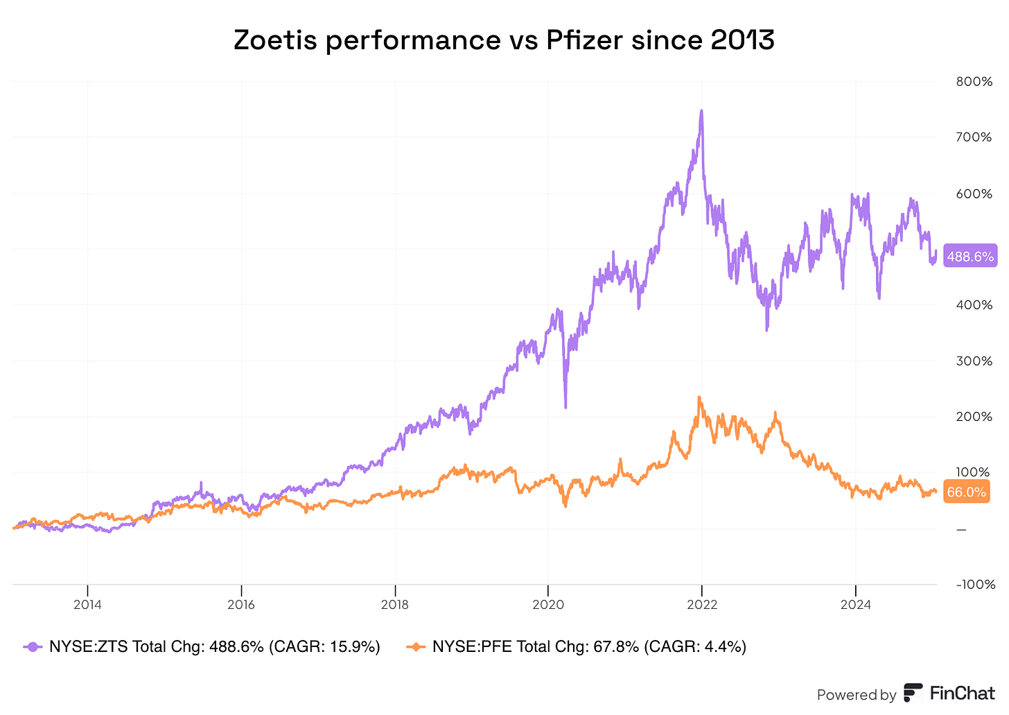 What’s interesting is how the divestiture was structured. Pfizer offered its existing shareholders a discount to purchase Zoetis stock; they could exchange $100 worth of Pfizer stock for $107.52 of Zoetis stock. This 7% discount was meant to encourage shareholders to purchase Zoetis’ stock, and those who felt encouraged ended up making a good decision. Zoetis has delivered ≈7x higher total returns than Pfizer since the time of the IPO: